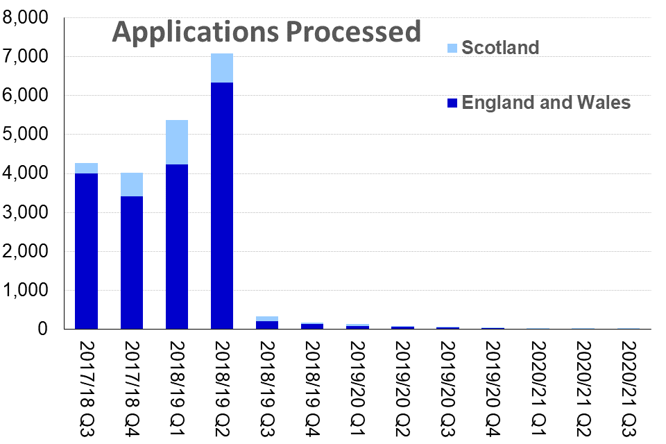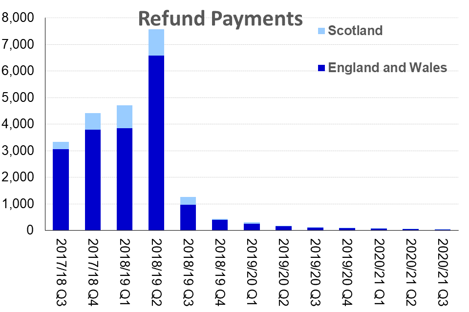 Between 1 October 2020 and 31 December 2020, 22 refund applications were received (down from 39 in Q2 2020/21) and 48 refund payments[footnote 3] were made with a total value of £166,000.