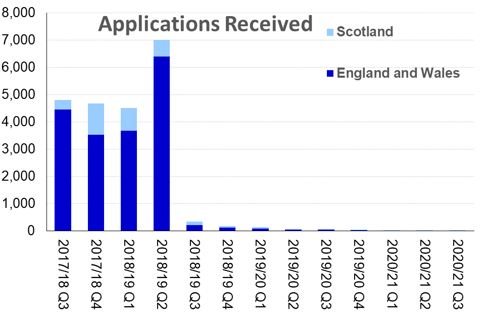 Of the applications received between October to December 2020, 95% (21 applications) related to cases initially brought in England and Wales, up from 54% in the quarter to 30 September 2020. The remaining 5% of applications received this quarter (one application) related to cases initially brought in Scotland.