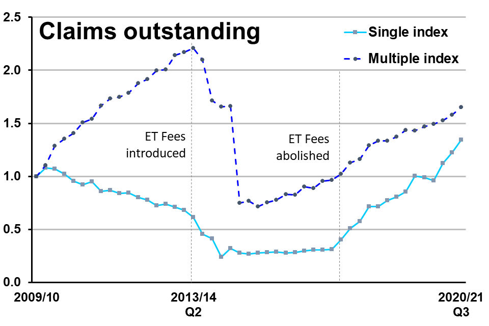 Figure 4.3: Index of Employment Tribunals single and multiple claims outstanding, Q1 2009/10 – Q3 2020/21 (Source: Tables S_4)