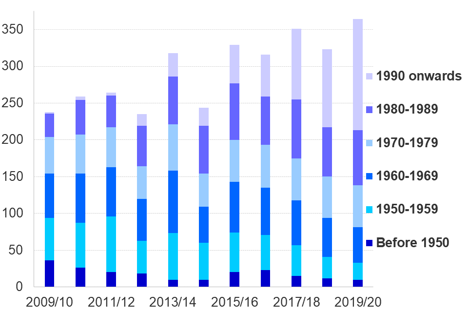 Figure 5.2: Full Gender Recognition Certificates granted by year of birth, 2009/10 to 2019/20 (Source: Table GRP_4)