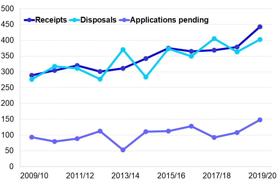 Figure 5.1: Applications for Gender Recognition Certificates received, disposed of and pending, 2009/10 to 2019/20 (Source: Tables GRP_1 and GRP_2)
