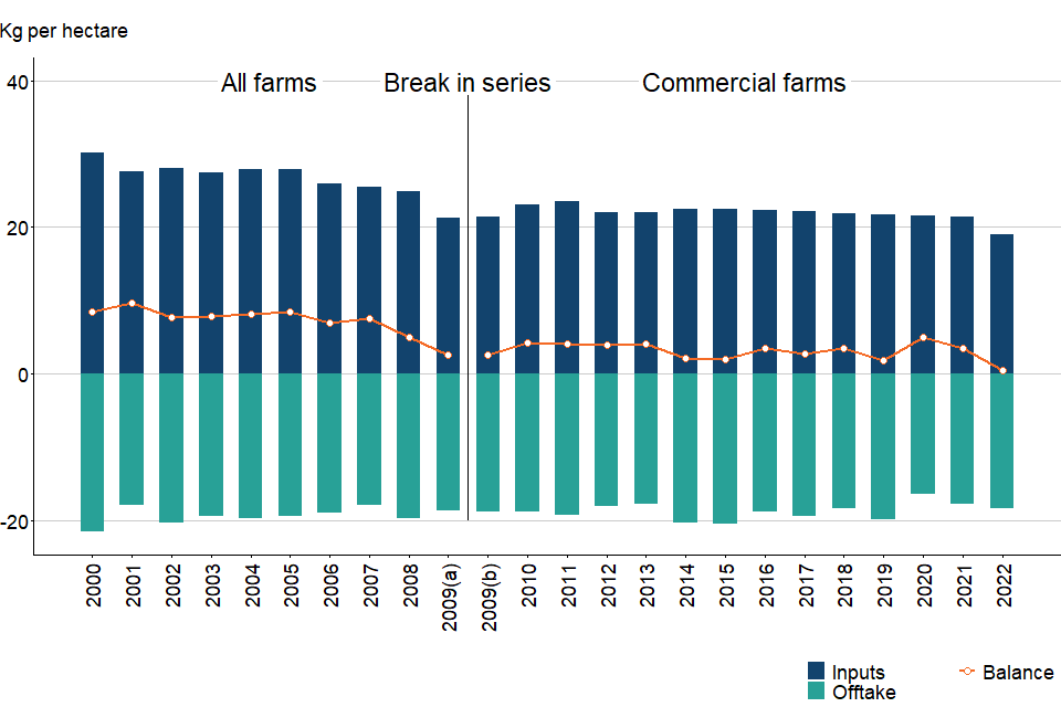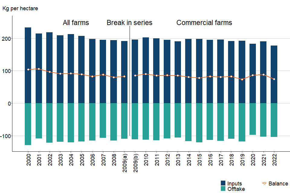 Managed agricultural land has been defined as the utilised agricultural area (UAA) excluding common land and sole right rough grazing. The balance per hectare is based on the area of managed agricultural land. This is based on the approximation that this is the only land to which significant levels of fertilisers and manures are applied. We are currently investigating potential methodological improvements to recognise changes to UK agricultural systems since the original methodology was devised. The 2021 data release (22 December 2022) included an adjustment to the estimate for the removal of straw, which resulted in an increase to the ‘Crop residues’ offtake component. The time series was backdated with the adjustment applied to all years for which data is published.