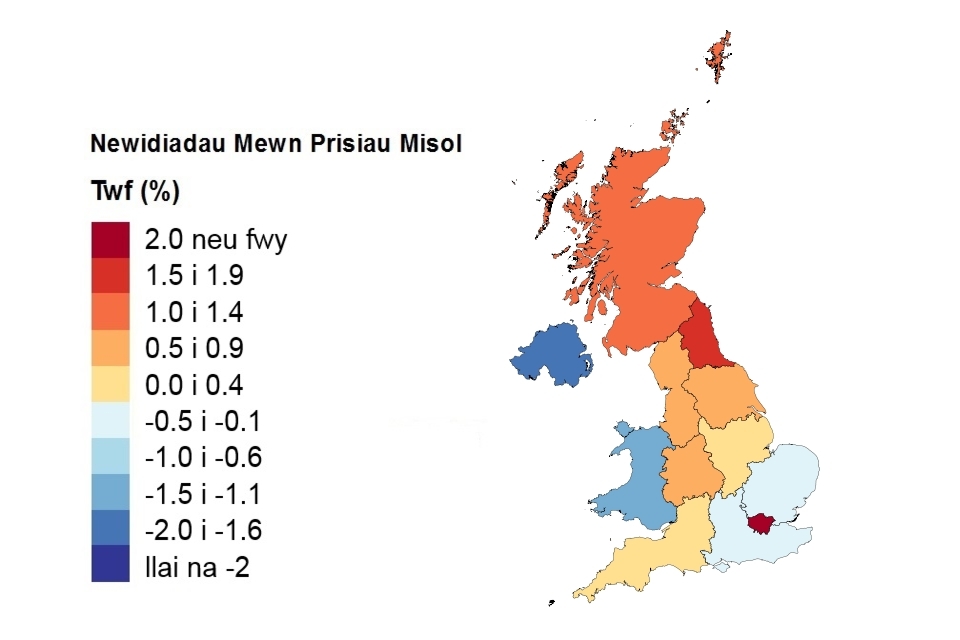 Pris, newid misol a newid blynyddol yn ôl gwlad a rhanbarth swyddfa’r llywodraeth