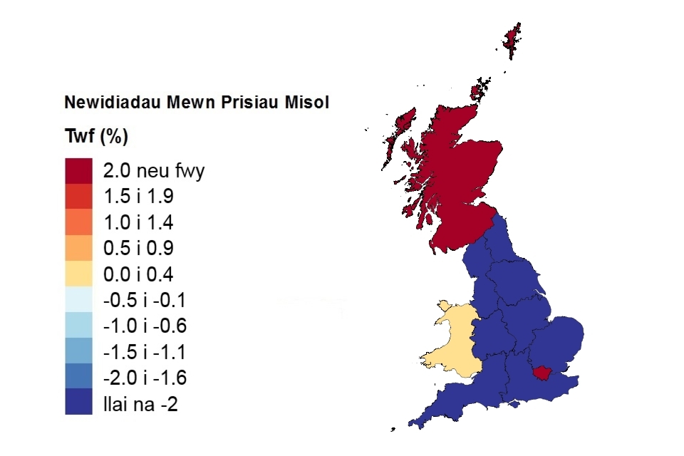 Pris, newid misol a newid blynyddol yn ôl gwlad a rhanbarth swyddfa’r llywodraeth