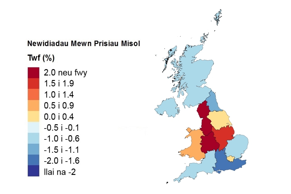 Pris, newid misol a newid blynyddol yn ôl gwlad a rhanbarth swyddfa’r llywodraeth