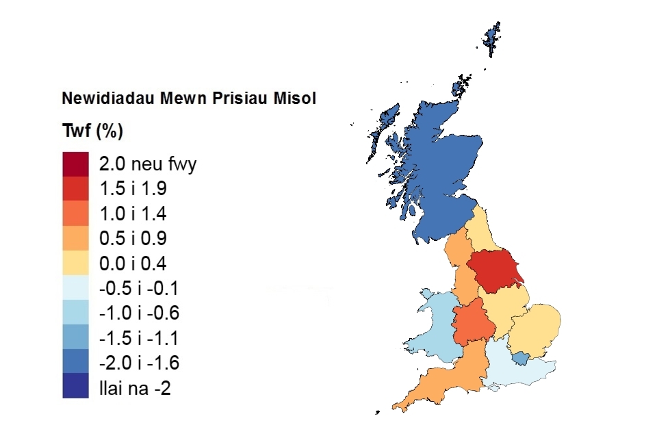 Pris, newid misol a newid blynyddol yn ôl gwlad a rhanbarth swyddfa’r llywodraeth