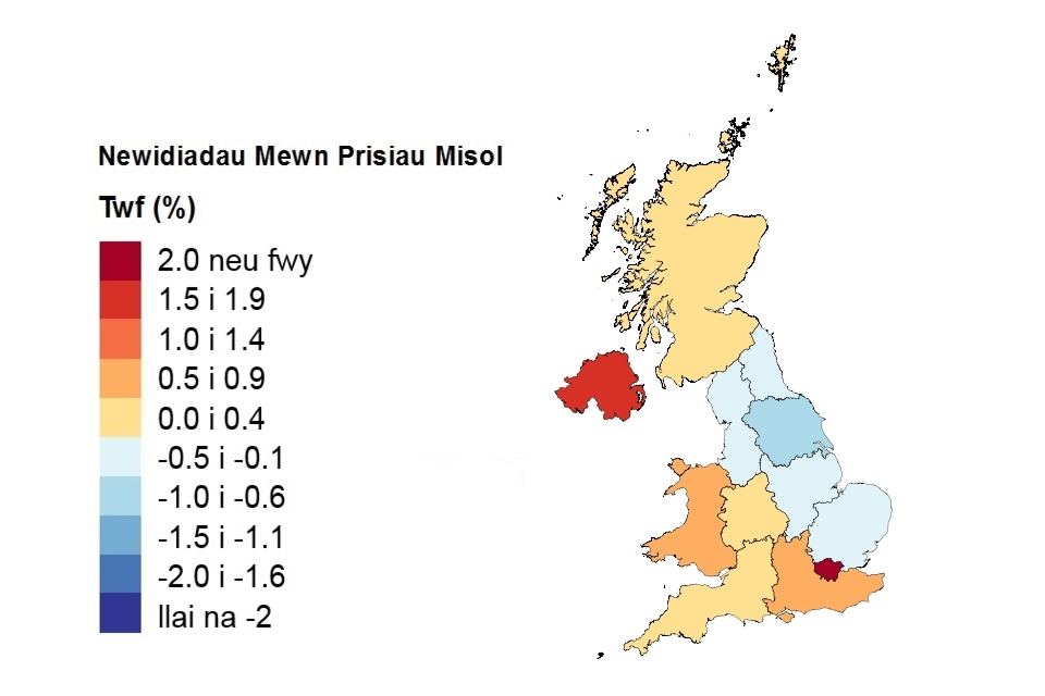Pris, newid misol a newid blynyddol yn ôl gwlad a rhanbarth swyddfa’r llywodraeth