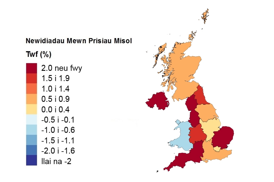 Pris, newid misol a newid blynyddol yn ôl gwlad a rhanbarth swyddfa’r llywodraeth