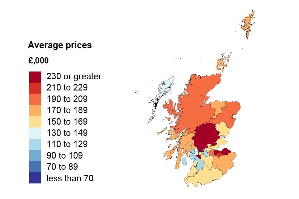 Low numbers of sales transactions in some local authorities, such as Orkney Islands, Na h-Eileanan Siar and Shetland Islands, can lead to volatility in the series.