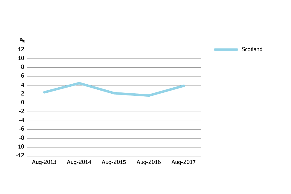 In Scotland, the average price increased by 3.9% in the year to August 2017 (up from 3.6% in the year to July 2017).