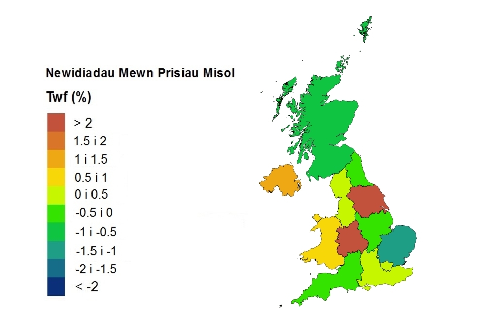 Pris, newid misol a newid blynyddol yn ôl gwlad a rhanbarth swyddfa’r llywodraeth