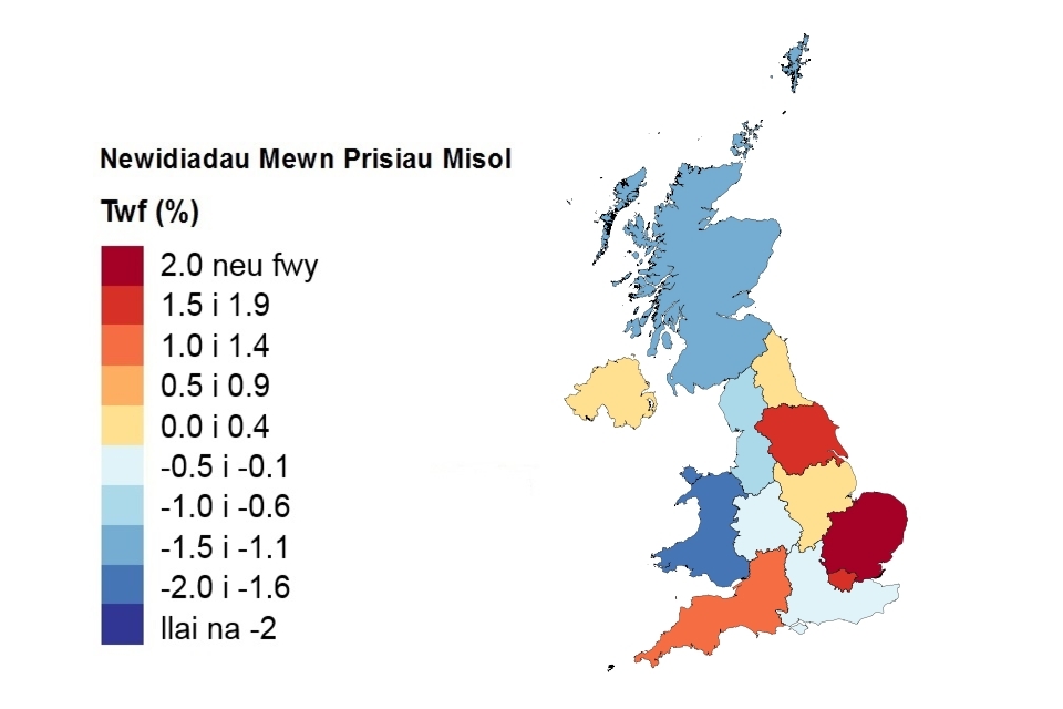 Pris, newid misol a newid blynyddol yn ôl gwlad a rhanbarth swyddfa’r llywodraeth