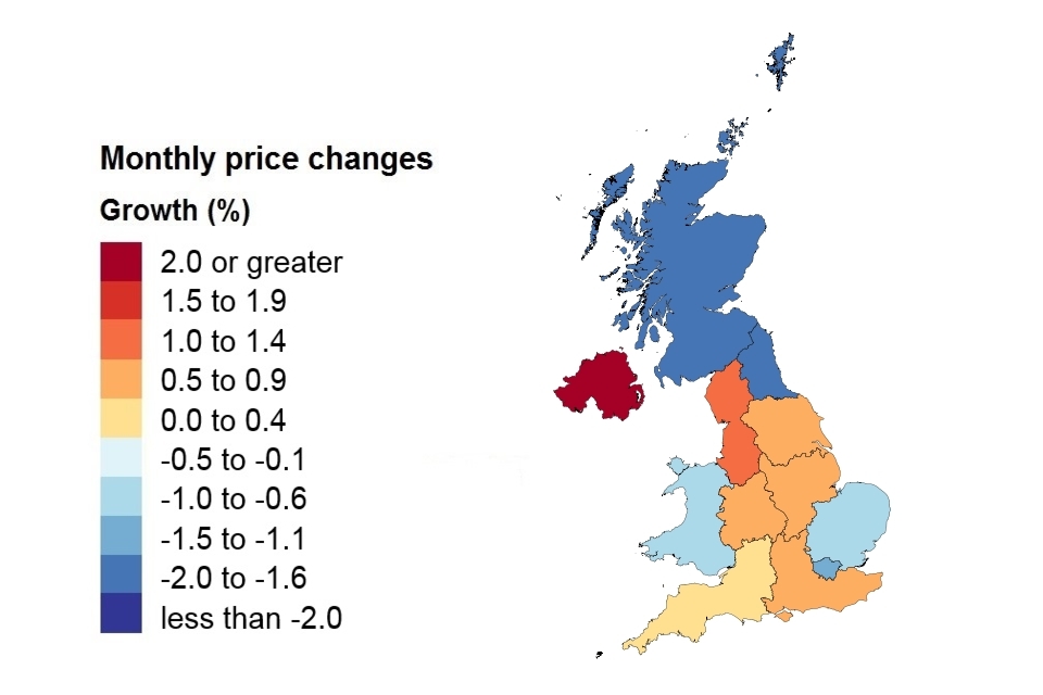 Price, monthly change and annual change by country and government office region