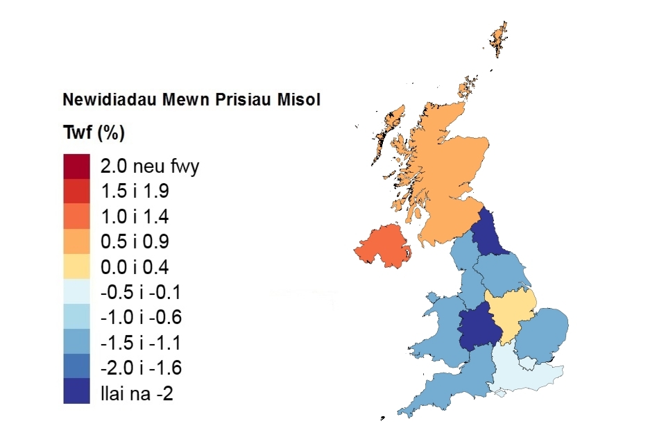 Pris, newid misol a newid blynyddol yn ôl gwlad a rhanbarth swyddfa’r llywodraeth