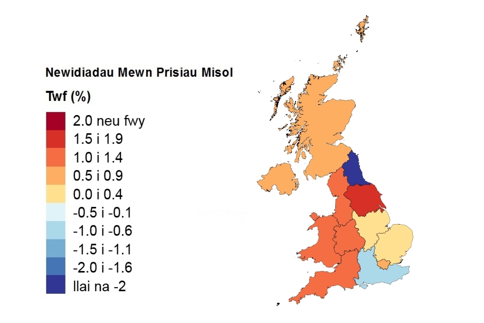 Pris, newid misol a newid blynyddol yn ôl gwlad a rhanbarth swyddfa’r llywodraeth