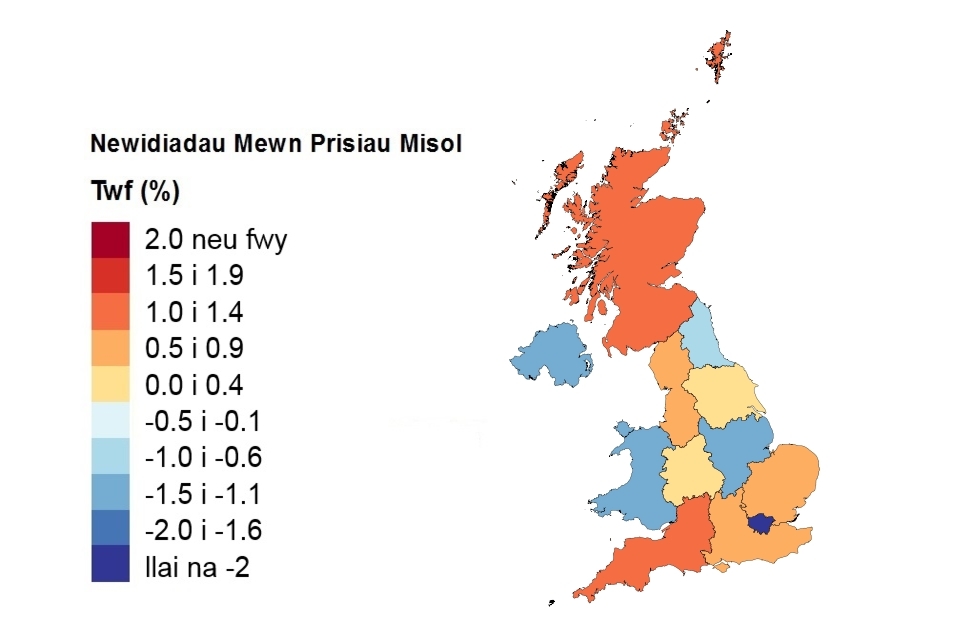 Pris, newid misol a newid blynyddol yn ôl gwlad a rhanbarth swyddfa’r llywodraeth