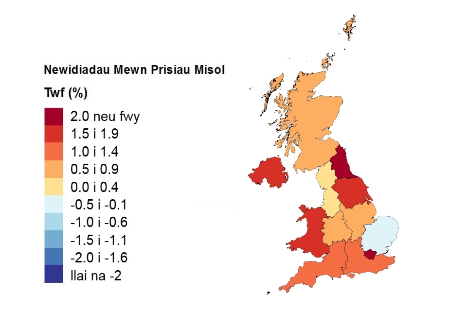 Pris, newid misol a newid blynyddol yn ôl gwlad a rhanbarth swyddfa’r llywodraeth