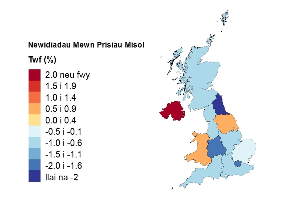 Pris, newid misol a newid blynyddol yn ôl gwlad a rhanbarth swyddfa’r llywodraeth