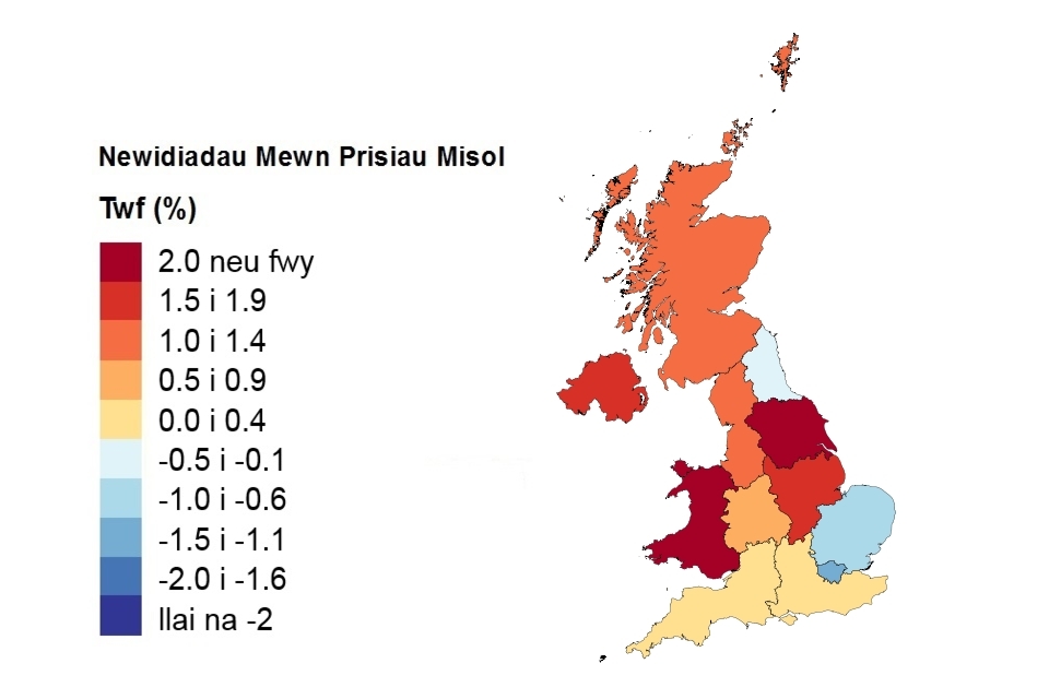 Pris, newid misol a newid blynyddol yn ôl gwlad a rhanbarth swyddfa’r llywodraeth