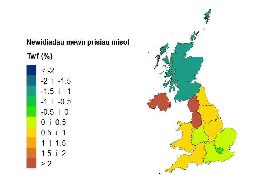 Pris, newid misol a newid blynyddol yn ôl gwlad a rhanbarth swyddfa’r llywodraeth