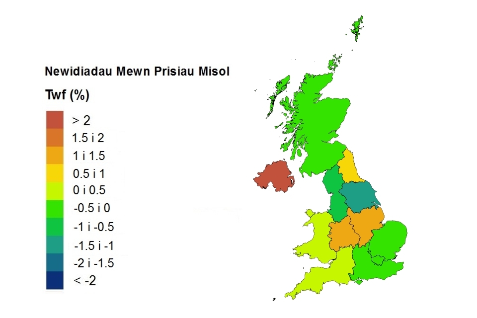 Pris, newid misol a newid blynyddol yn ôl gwlad a rhanbarth swyddfa’r llywodraeth