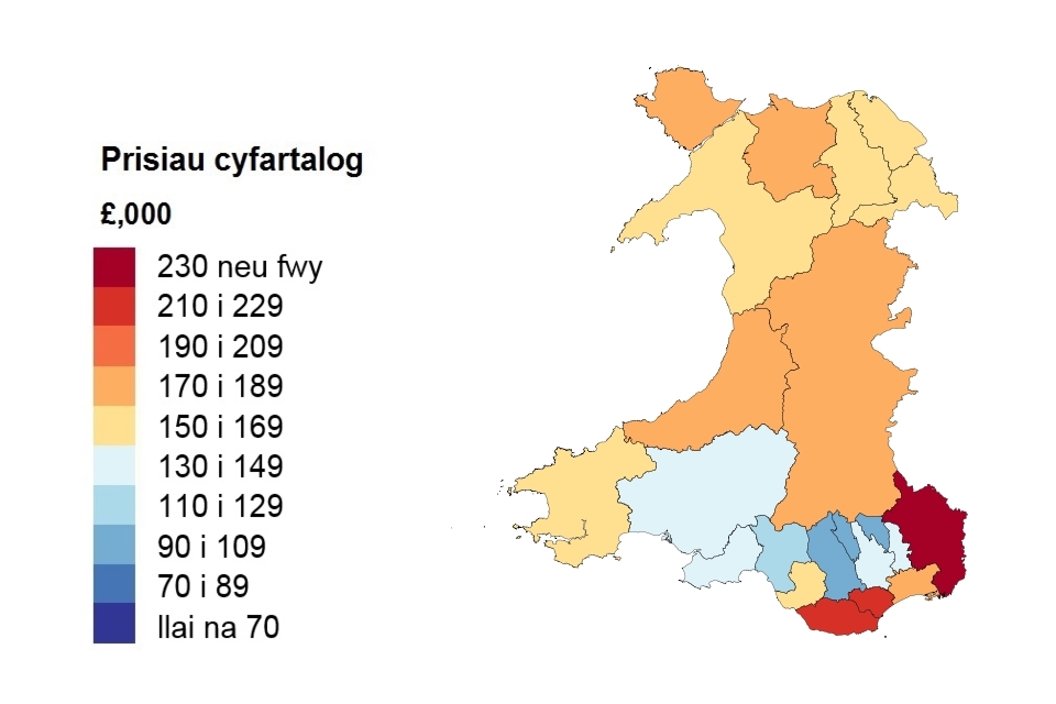 A heat map showing the average price by local authority for Wales (in Welsh)