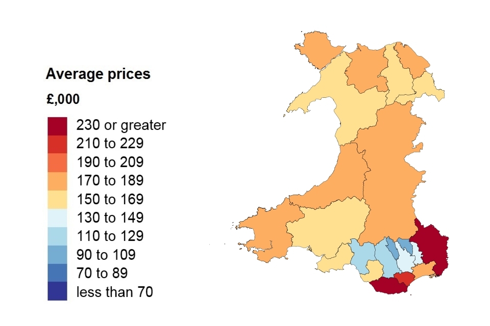 A heat map showing the average price by local authority for Wales.