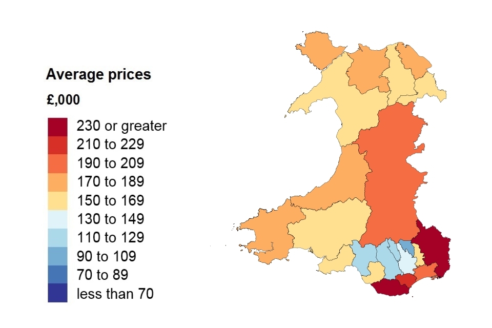 A heat map showing the average price by local authority for Wales.