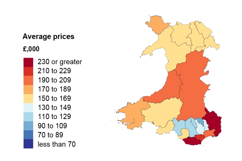 A heat map showing the average price by local authority for Wales.