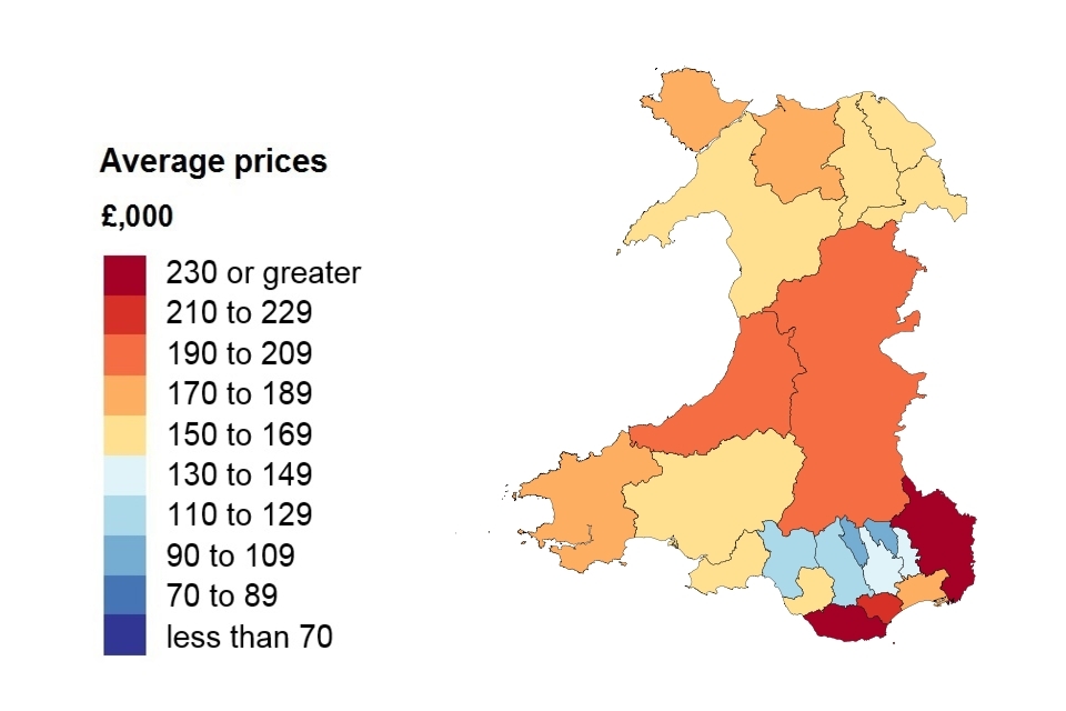 A heat map showing the average price by local authority for Wales.