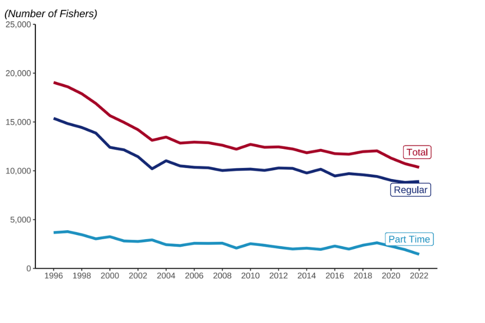 The number of part time fishers in 2022 decreased by 25% since 2021 and is 63% less than in 1995. The decrease in number of part-time fishers in 2022 from 2021 can be accounted for due to changes in COVID. With crewing on vessels becoming more stable with the easing of COVID regulations, more part-time fishers left or became regular fishers. This is reflected by a slight increase in regular fishers in 2022 compared to 2021, when numbers have been decreasing since 2017.