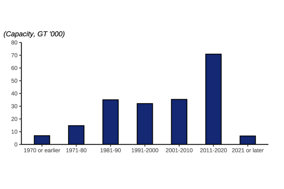 Vessels built in 2011 or later have a much higher capacity than vessels built prior to 2011. While the number of vessels built in the last four decades has decreased, the total capacity and power of those built since 2011 has increased substantially. These modern vessels (built since 2011) contribute 38% of the fleet’s capacity, while only making up 14% of the vessels in the UK fleet. In comparison, vessels built between 1981 and 1990 account for 25% of the total number of vessels in the fleet but only 17% of the fleet’s total capacity. This illustrates the transition within the UK fleet to fewer but larger vessels that have higher capacity and are more efficient in utilising the fishing opportunities available.