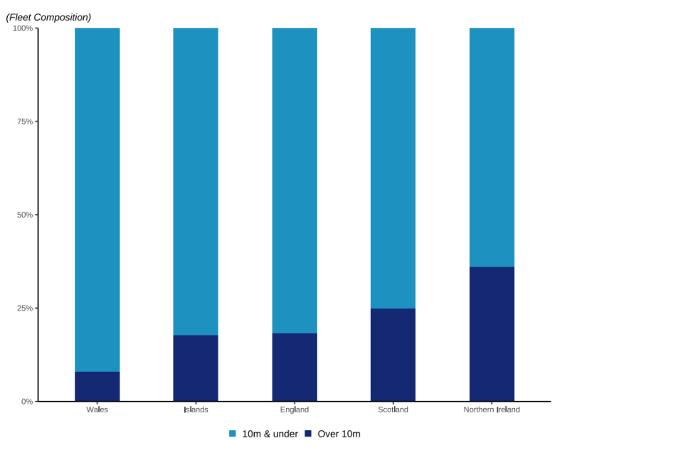 The fleet with the largest proportion of vessels over 10 metres in the UK is the Northern Irish fleet. The different length composition of the fleet can again be used to explain why the Northern Irish fleet has more capacity and power than the Welsh and island fleets, despite having a similar number of vessels.