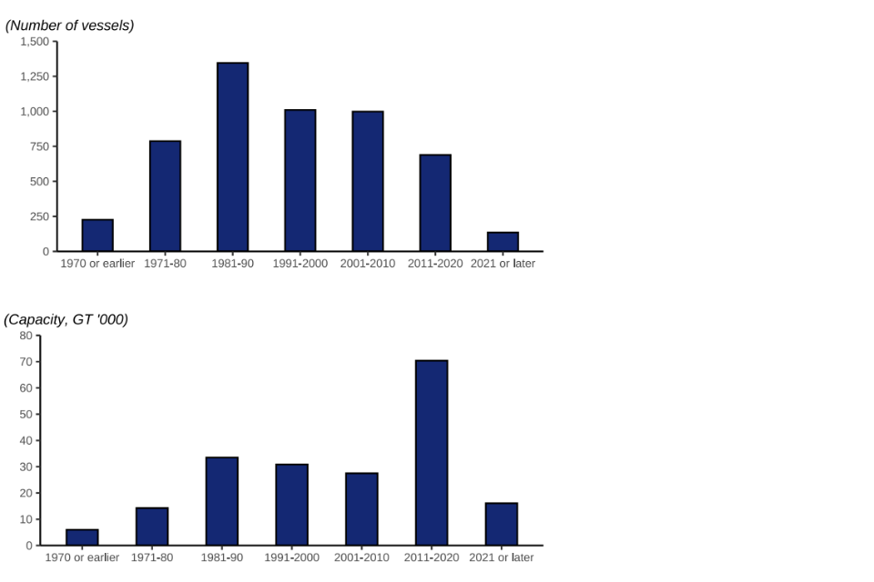 Vessels built in 2011 or later have a much higher capacity than vessels built prior to 2011. While the number of vessels built since 2011 has decreased, the total capacity and power of those built since 2011 has increased substantially. These modern vessels (built since 2011) contribute 43% of the fleet’s capacity, while only making up 15% of the vessels in the UK fleet. In comparison, vessels built between 1981 and 1990 account for 25% of the total number of vessels in the fleet but only 17% of the fleet’s total capacity. This illustrates the transition within the UK fleet to fewer but larger vessels that have higher capacity and are more efficient in utilising the fishing opportunities available.