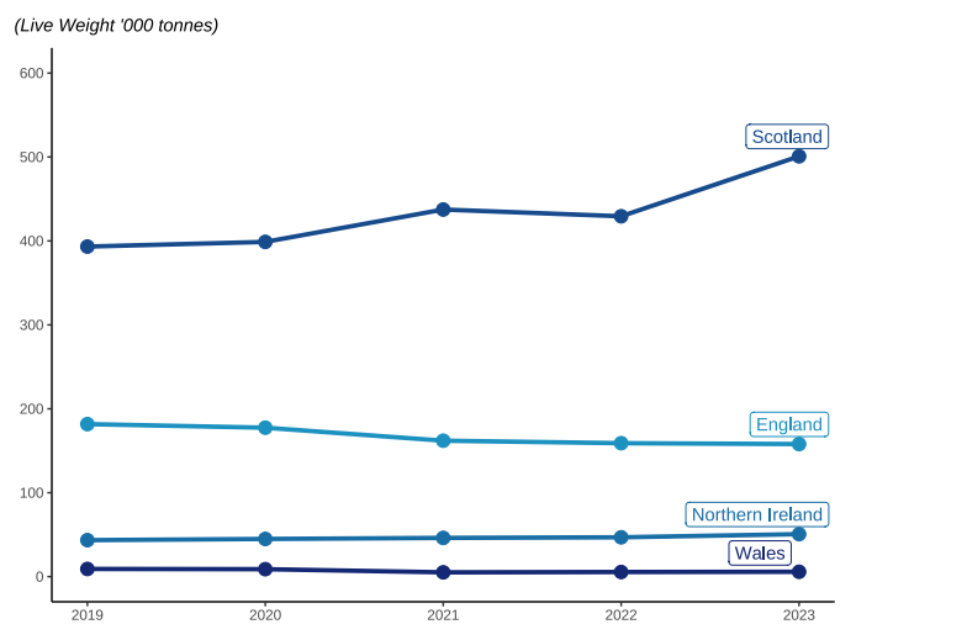 Of the four UK nations, Scotland lands the most fish by quantity and value. At the country level, the landed weight of fish by each of the four nations has remained relatively stable over time. However, there was a 17% increase in landings by Scottish vessels between 2022 and 2023. This increase was mainly driven by an increase in landings of pelagic species, which is an important economic sector for the Scottish fleet, due to an increase in quota for key pelagic species including Mackerel and Blue Whiting in 2023.