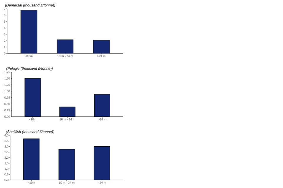 Overall, vessels under 10 metres fetch a higher price per tonne for their landings (£3,900) compared to vessels over 24 metres (£1,200). This is especially true for demersal catches. Landings of demersal species by larger vessels tend to be frozen on board the vessel and sold in bulk, contributing to their lower price per tonne.