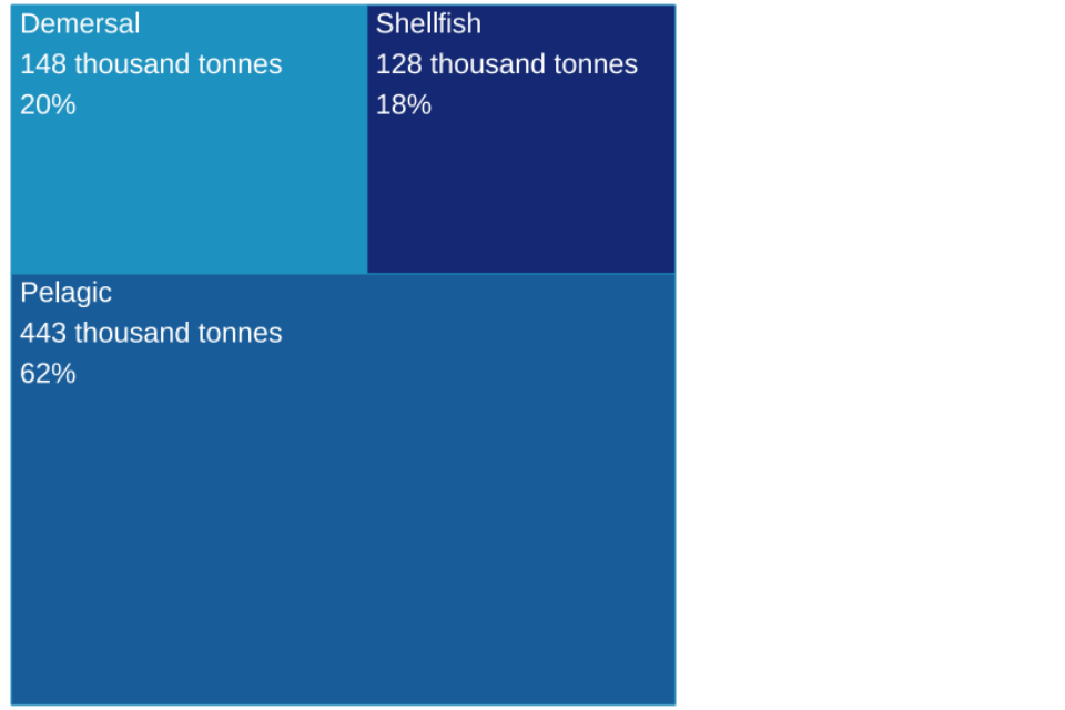 Typically, shellfish landings form a high proportion of landings from enclosed sea areas with large coastal stretches (Irish Sea, Bristol Channel, English Channel and the Southern North Sea), while pelagic species form the majority of landings from open waters such as the West of Scotland, Northern North Sea, West of Ireland and Porcupine Bank.