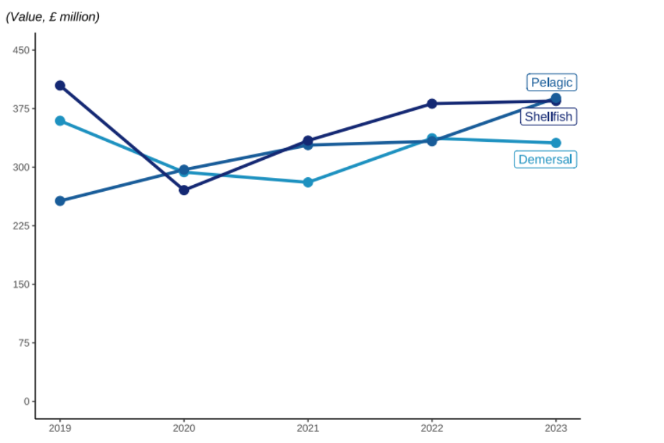 The value of landings increased in 2023 for pelagic and shellfish, with a slight decrease for demersal species when compared to 2022.