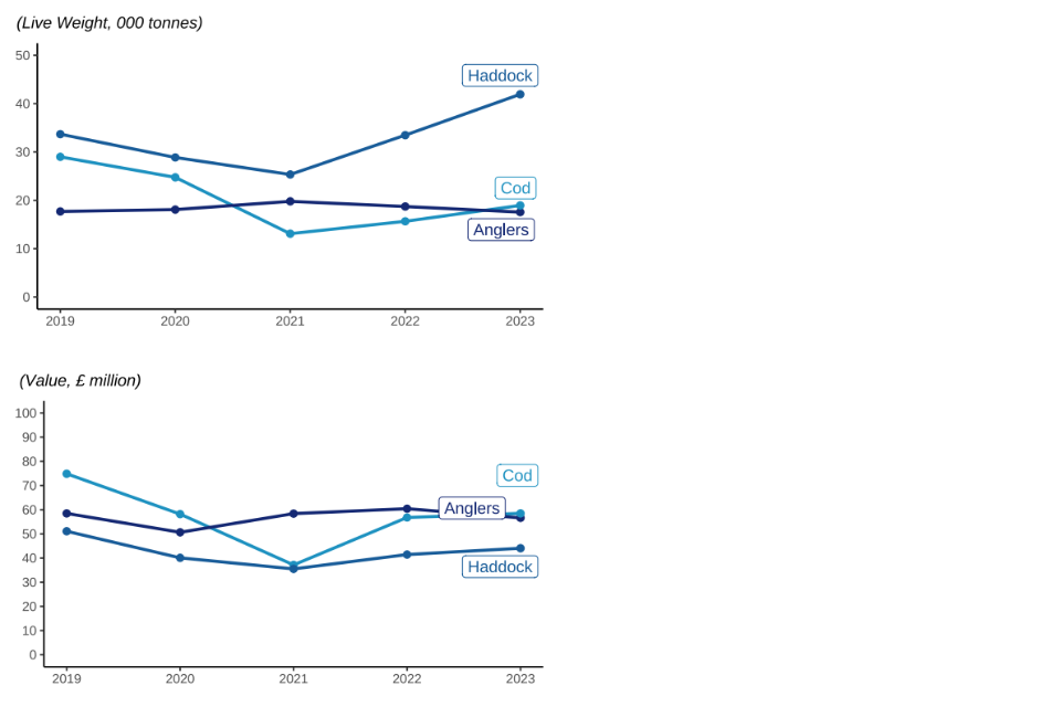 Figure 2.7: Quantity and value of landings in 2023 by UK vessels of different demersal species fish; Cod, Haddock, and Monks or Anglers.