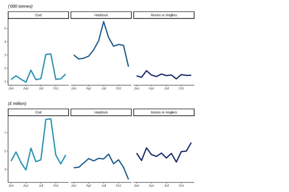 Landings of cod fluctuate more than haddock and anglerfish as the UK’s distant water fleet has targeted cod in e.g., Faroese waters and the waters around Svalbard. The distant water fleet are vessels that fish outside their own territories and often into other countries Exclusive Economic Zones (EEZ) and international waters. These large vessels can be out to sea for months and land huge volumes of fish at a time. This explains the spikes in quantity landed every few months.