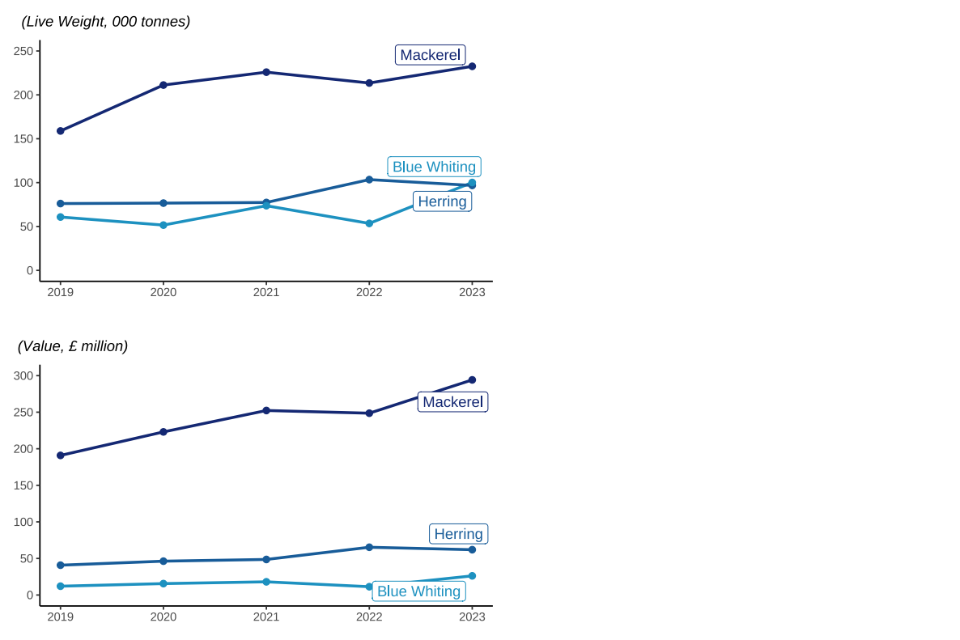 Figure 2.10: Quantity and value of landings in 2023 by UK vessels of different pelagic species fish; Blue Whiting, Herring, and Mackerel.