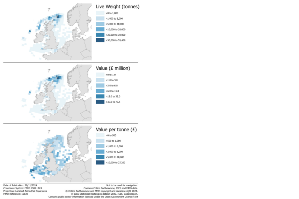 The following maps show landings of shellfish species by the UK fleet in 2023 by ICES rectangle of capture. In 2023, both the largest quantity and value of shellfish species were captured in rectangles relatively close to the coast of the UK. However, shellfish species with high prices were typically captured in rectangles away from coastal areas.