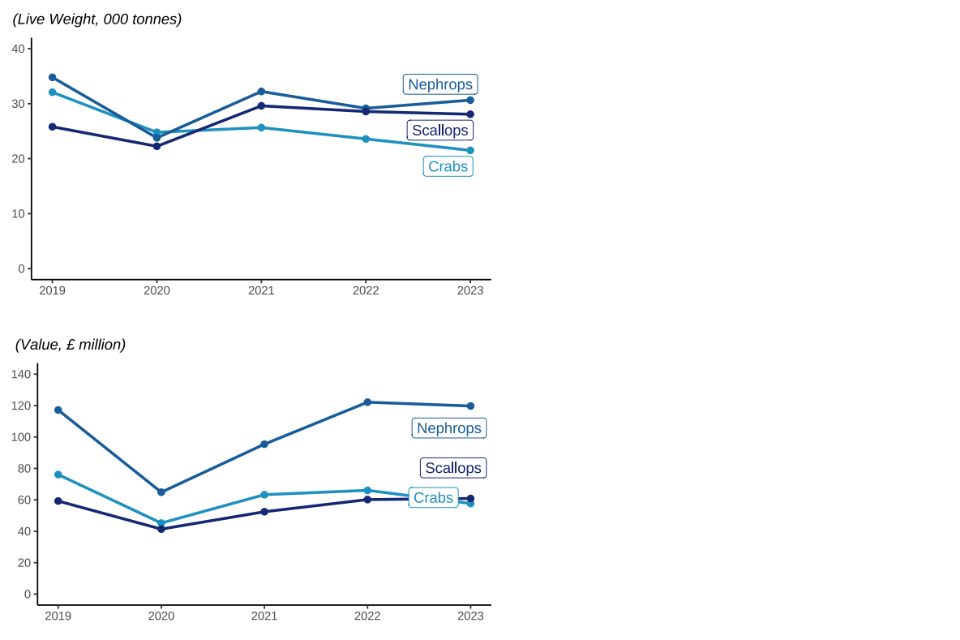 Figure 2.13: Quantity and value of landings in 2023 by UK vessels of different shellfish species fish; Edible Crabs, Nephrops, and King Scallops.