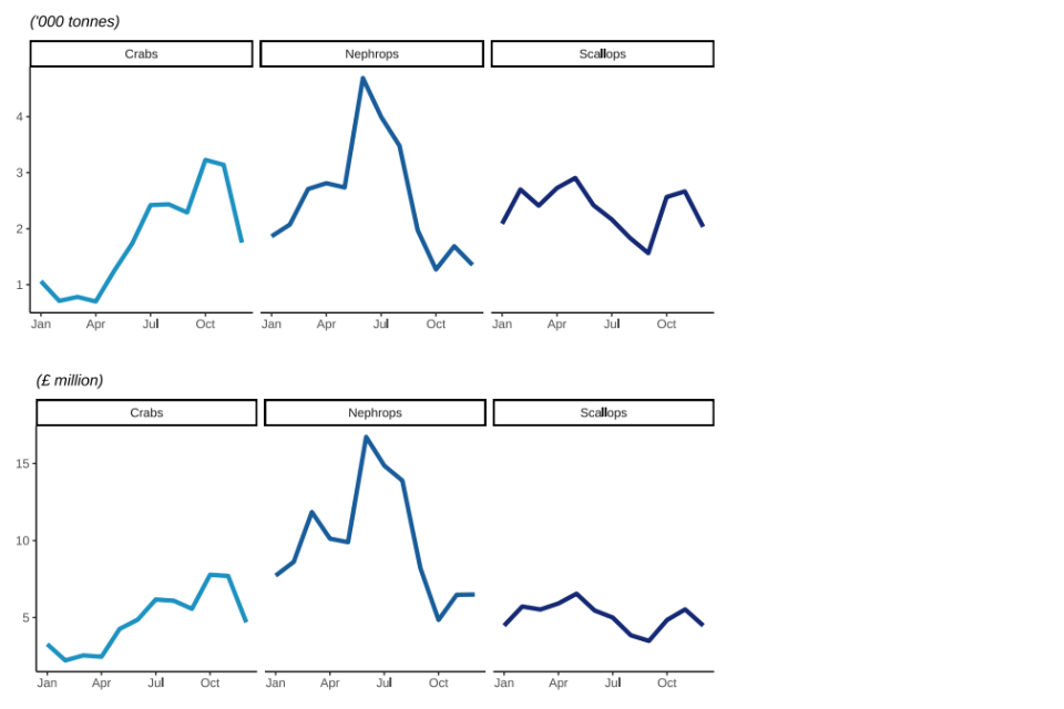 Landings of Nephrops fluctuate but show the highest peak in summer months. Crabs and scallops peak in landings towards the end of the year before the Christmas period.