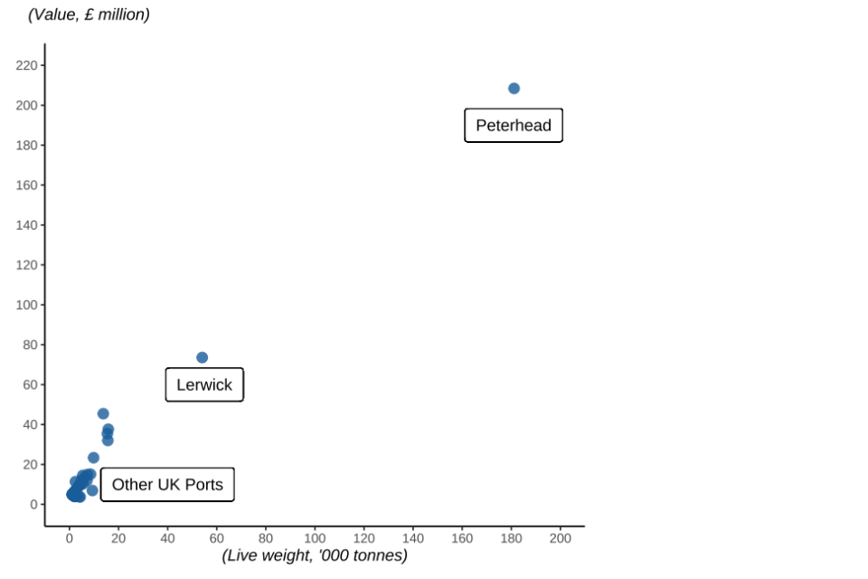 Approximately 72% of all landings by UK vessels into Scotland were into Peterhead and Lerwick. This is because Peterhead and Lerwick specialise in pelagic species.