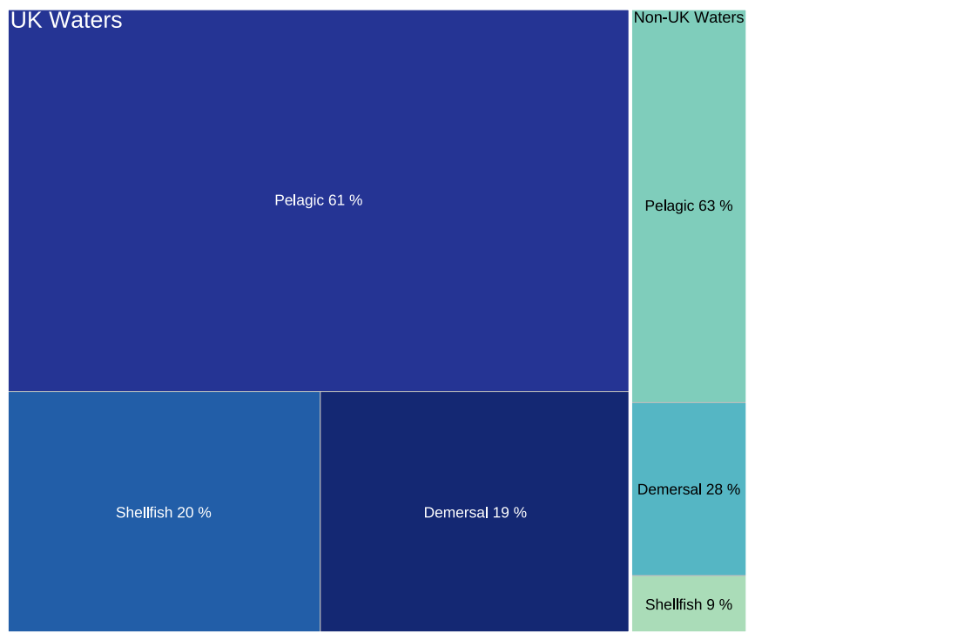 Pelagic species make up 62% of the total quantity of landings by UK vessels, while only contributing just over a third of the value landed [17]. This is because pelagic species typically fetching a lower price per tonne. Shellfish landings made up 18% of the total quantity landed but accounted for 35% of the value landed, which was slightly less than the value of pelagic landings.