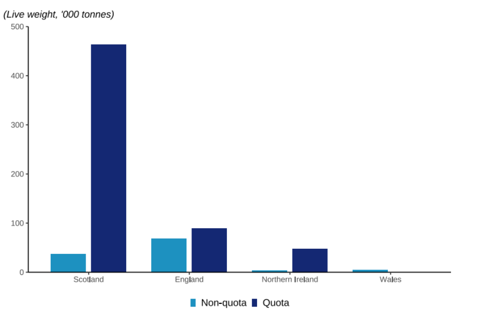 Figure 2.25: Quantity of landings by UK vessels of non-quota and quota species in 2023 by fisheries administration.