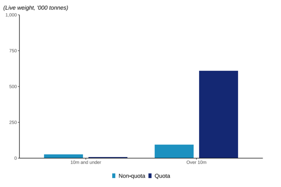 Quota allocations are primarily based on Fixed Quota Allocation (FQA) units. These are mainly held by vessels in the sector based on their fishing track record of catching quota species. Most vessels in the sector – a member of a Fish Producer Organisation – are vessels over 10 metres in length. Vessels under 10 metres in length are mainly part of the non-sector and are allocated a small proportion of the total UK quota. Their landings of quota species are therefore less.