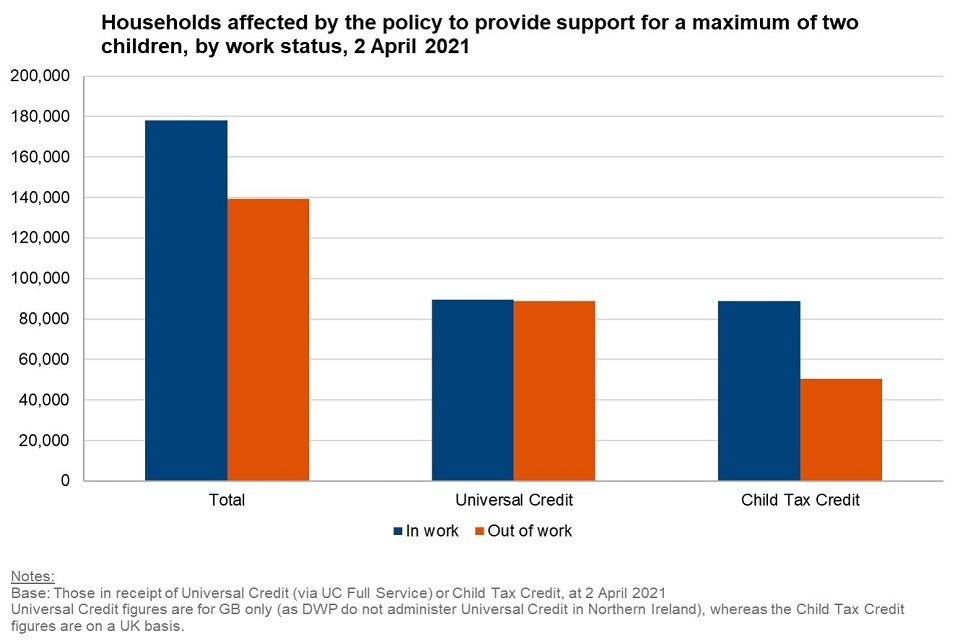 • on 2 April 2021, there were 308,520 households that had a third or subsequent child born on or after 6 April 2017 that were not receiving the child element of Universal Credit or Child Tax Credit because of the policy to provide support for a maximum of two children