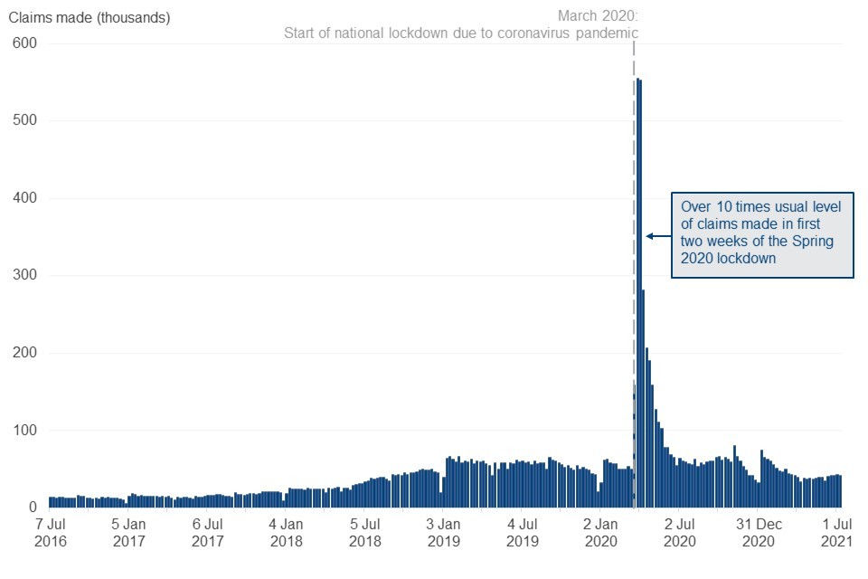 - 42,000 claims made to Universal Credit per week in the 4 weeks to 8 July 2021